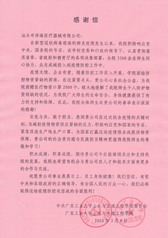 全体师生向汕头市泽海医疗器械有限公司的善举表示深深的感谢!我们坚信,有党中央和各级政府的正确领导,有全国人民的万众一心,我们必将取得这场疫情防控攻坚战的全面胜利!