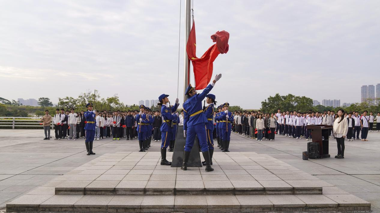 在学校正门广场举行“铭记历史当自强 奋勇逐梦谱华章”主题升旗仪式。学院党委副书记陈颂坚、团委书记刘思利、2025级辅导员唐熙、研究生辅导员梁伟源与2025级全体新生共同见证这一庄严时刻。仪式由2025级辅导员刘甜甜主持。