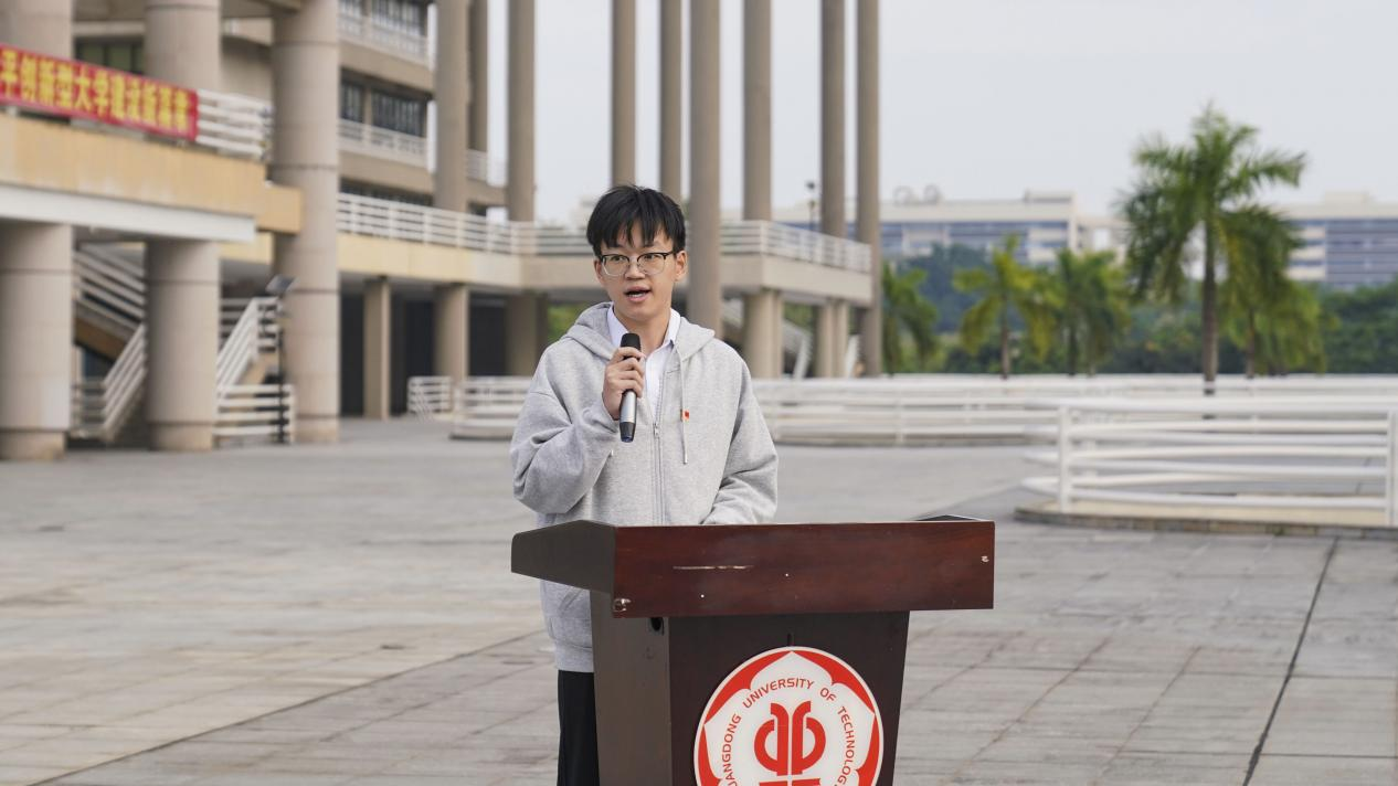 研究生三年级学生黄羡伦结合七年求学经历,以“初心、奋斗、笃行”为关键词分享成长感悟。他谈到,初心源于对知识的渴求,奋斗铸就直面困难的勇气,笃行体现为学术诚信与责任担当。他呼吁同学们铭记校训,厚植家国情怀,勇担时代使命。