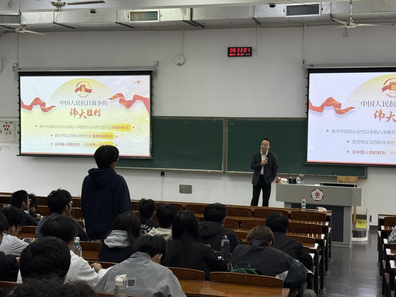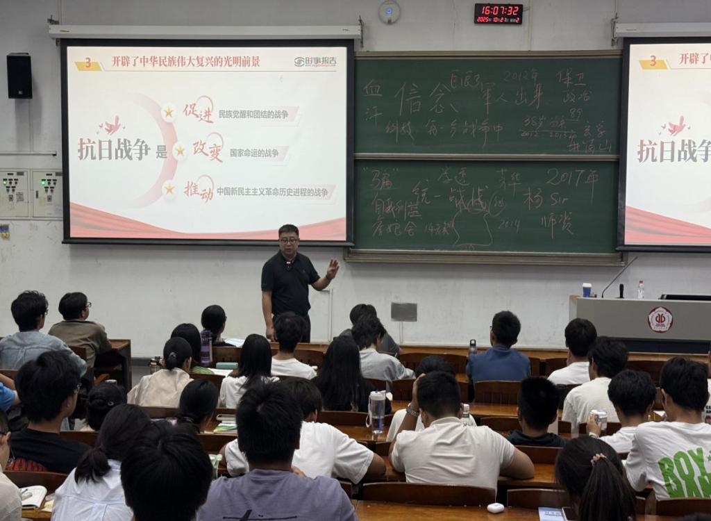 21日,赵志伟以“纪念抗战胜利,坚定民族信念”为主题,拉开了本次思政课的序幕。他以“信念”为引,在举国纪念抗日战争胜利80周年的重要历史节点,为同学们带来一堂深刻而富有时代意义的思政课。他借助详实的历史文献、珍贵的影像资料,带领同学们重回那段风雨如晦的岁月,生动展示了中华民族在14年抗战中所彰显的不屈意志与抗争精神。课程中,他深入阐释中国共产党作为全民族抗战中流砥柱的关键作用,深刻剖析抗战精神在新时代的传承意义,引导同学们树立正确的中华民族历史观,从厚重的民族记忆中汲取砥砺前行的精神力量。